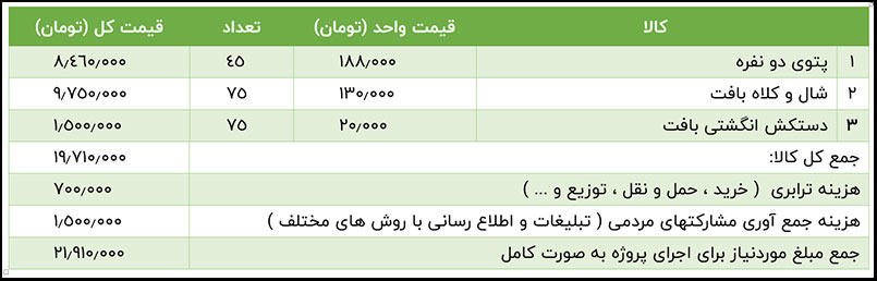جمع مبلغ مورد نیاز برای اجرای کامل این پروژه ( 45 پتوی دونفره + 75 ست شال و کلاه و دستکش بافت ) : 21.910.000 تومان