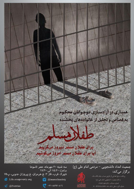 آئين طفلان مسلم، با محوريت کودکان و نوجوانان کار و خيابان - به طور کلي آنچه از آن با عنوان "بزهکاري نوجوانان" ياد ميشود - از جمله طرحهايي است که جمعيت امداد دانشجويي-مردمي امام علي(ع)، بر پايه ريشههاي عميق فرهنگي و ديني ايرانيان از سال 85 اقدام به برگزاري آن کرده است.