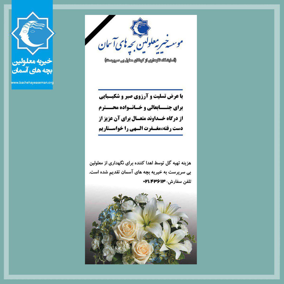 شما میتوانید تابلوهای تسلیت موسسه خیریه بچههای آسمان را در مراسم سوگواری برای تسلیت به دوستان و آشنایانتان ارسال نمایید. در این صورت هزینه سفارش تابلو تسلیت کمکی به مددجویان بچههای آسمان است و با مشارکت در این کار خیر، فرهنگ آن را نیز ترویج میدهید.