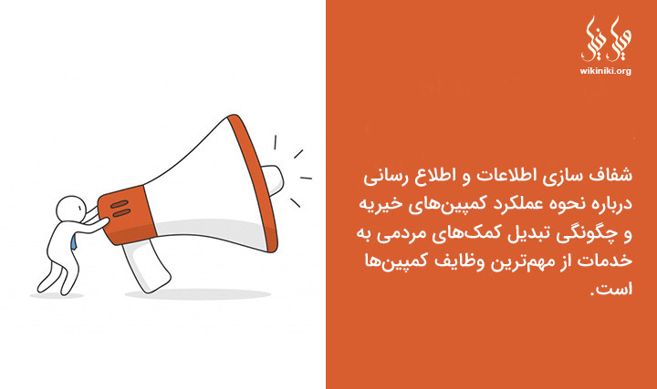 موسساتی که قصد برگزاری کمپینهای نیکوکارانه برای رفع مشکل و معضلی را دارند، ابتدا افراد را نسبت به آن معضل آگاه کرده و سپس آنها را متقاعد میکنند که برای رفع آن، احتیاج به مشارکت نیکوکاران دارند و همواره باید شرایط ارتباطی را فراهم کنند تا افراد در جریان امور، قرار بگیرند.