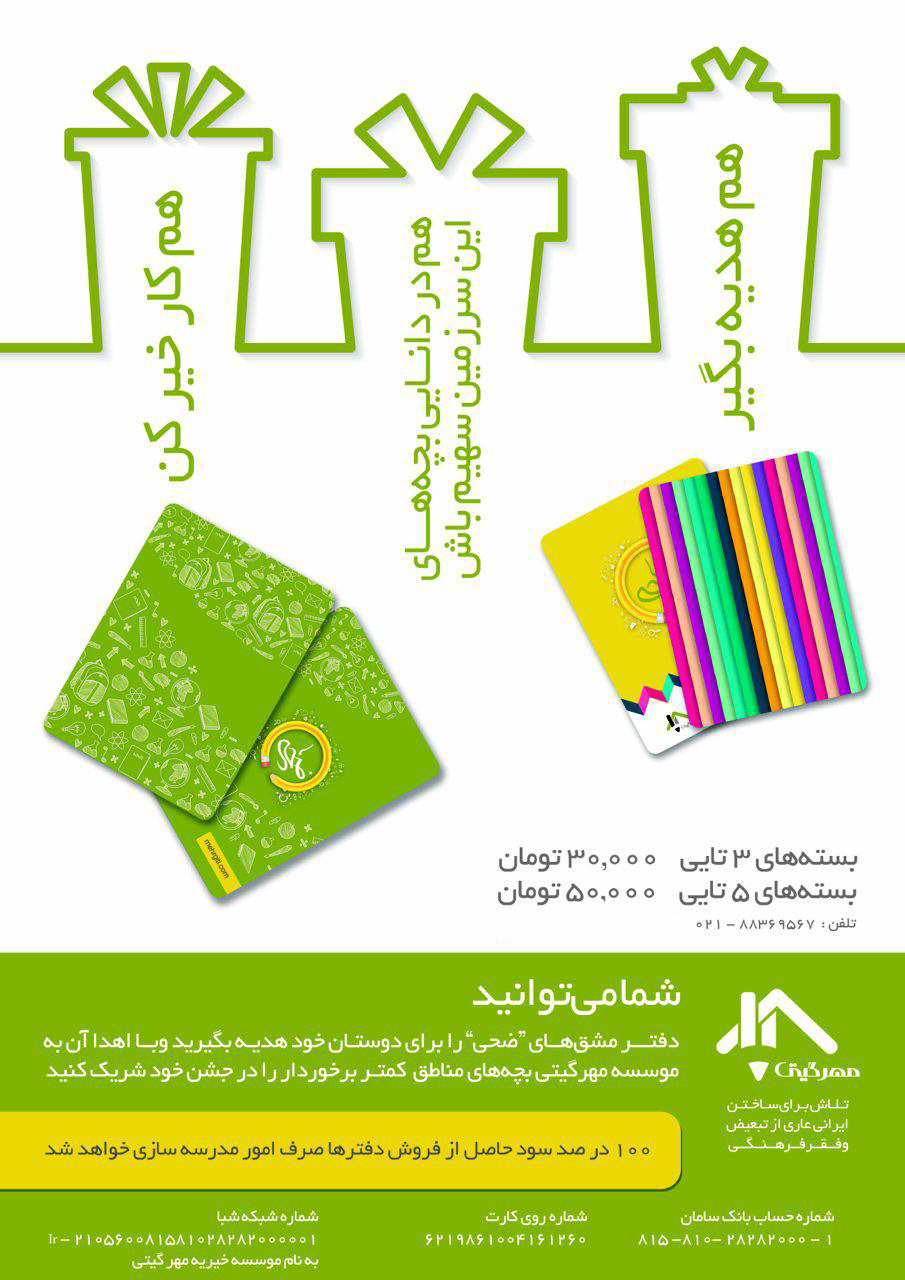این کار نیک به ساخت همین مدرسه ختم نخواهد شد و در صورت حمایت نیکوکاران در این طرح در سراسر ایران گسترش خواهد یافت. خیرین میتوانند علاوه بر خرید این دفترها، دفاتر خریداری شده را نیز به کودکان محروم هدیه دهند.