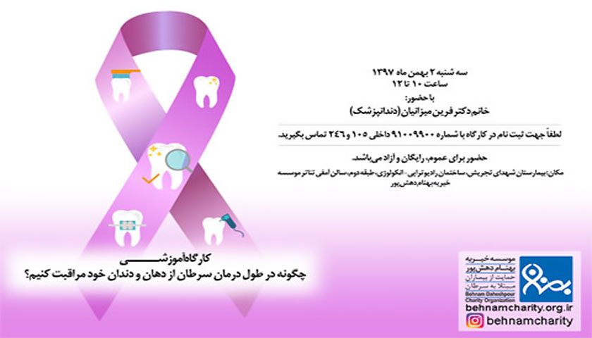 به مناسبت هفته سرطان، کارگاه آموزشی «چگونه در طول درمان سرطان از دهان و دندان خود مراقبت کنیم؟» با حضور داوطلبانه خانم دکتر «فرین میزانیان»، (دندانپزشک) با همکاری موسسه خیریه «بهنام دهشپور»، برگزار خواهد شد.