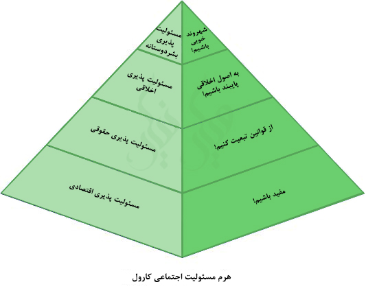 همچنین "کارول" درسال 1991 اصول چهارگانه ای را تحت عنوان" هرم مسئوليت پذيری اجتماعی" معرفی كرد که عبارتند از: