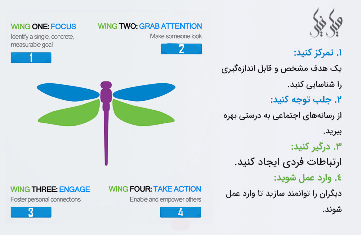حالا چرا به این اثر سنجاقکی میگوییم؟ سنجاقک تنها حشرهای است که قادر است وقتی هر چهار بالش با هم هماهنگ کار کنند، به هر جهتی خود را سوق دهد. سنجاقک نمادی است از اهمیت اثرهای در همآمیخته و شبیه به اثر موجهای حلقوی (وقتی سنگی در آب میاندازیم) است. اثر موج های حلقوی اصطلاحی در اقتصاد، جامعه شناسی، و روانشناسی است که نشان میدهد چطور کنشهای کوچک میتوانند تغییرات بزرگی ایجاد کنند. اثر سنجاقکی به ما نشان میدهد که چطور ایده های هماهنگ شده را میتوان به کار گرفت تا در رسانههای اجتماعی تغییرات سریعی ایجاد کرد.