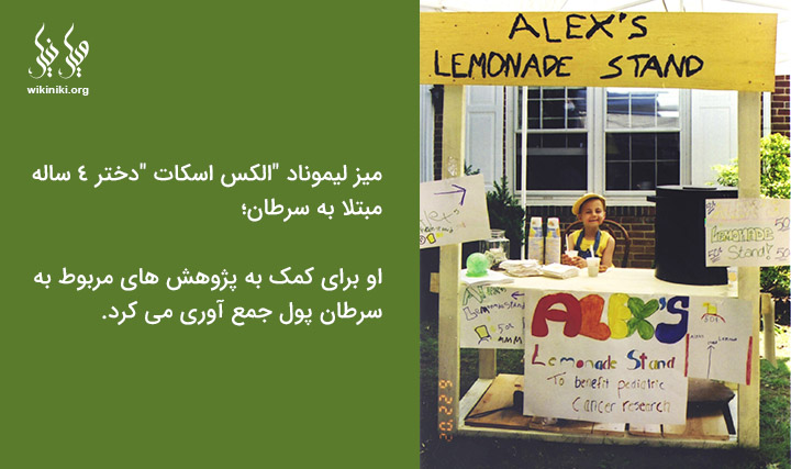 الکس اسکات از جهات بسیاری، یک بچه معمولی بود. غذای مورد علاقهاش سیبزمینی سرخشده و رنگ مورد علاقهاش آبی بود. این دختر امیدوار بود که روزی یک طراح مد شود. اما اسکات از جهات دیگر متفاوت بود. درست پیش از تولد یک سالگیاش تشخیص داده شد که به نوروبلستوما مبتلا است که یک سرطان جهنده مخصوص کودکان است. از پشتش غدهای را برداشتند، و دکترها به والدینش، لیز و جی اسکات، گفتند که اگر این دختر سرطان را شکست دهد به احتمال زیاد نمیتواند راه برود. دو هفته بعد الکس اسکات پایش را تکان داد - یکی از اولین سرنخها درباره مصمم بودن و توانایی او همین بود. وقتی اسکات چهارساله بود بعد از دریافت پیوند سلولهای بنیادی برنامهای به ذهنش رسید که از آن به بعد شیوه مواجهه او و خانواده اش با سرطان را تغییر داد. او گفت: «وقتی از بیمارستان بیرون بیایم میخواهم یک میز داشته باشم که رویش لیموناد بفروشم». اسکات میخواست پولی که از این راه درمیآورد را صرف مبارزه با سرطان و کمک به کودکان دیگر کند. والدین او الان اعتراف میکنند که آن موقع به پروژه اسکات خندیدند. با اینکه از هر سیصد و سی کودک آمریکایی یک نفر قبل از بیست سالگی دچار سرطان میشود، پژوهش در مورد سرطان کودکان دائما دچار کمبود بودجه است. آنها اسکات را نصیحت کردند که با پنجاه سنت پنجاه سنت پول چندانی جمع نخواهد کرد. او پاسخ داد: «عیبی ندارد. بههرحال اینکار را میکنم».