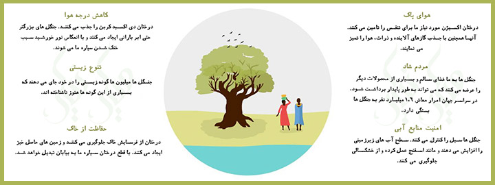 درختان اکسیژن مورد نیاز ما برای تنفس را تامین میکنند. آنها همچنین با جذب گازهای آلاینده و ذرات معلق، هوا را تمیز مینمایند. - مردم شاد