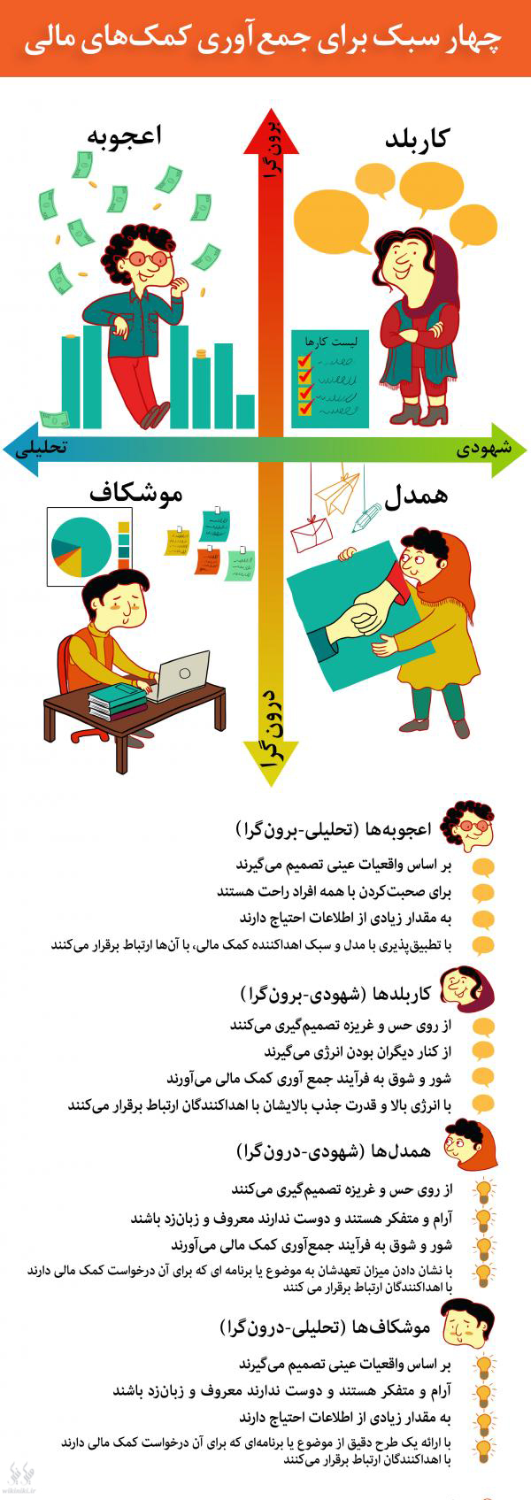 بسیاری از فعالان مردمنهاد احساس میکنند که نمیتوانند از عهده مذاکره و رویارو شدن با یک حامی بالقوه مالی و درخواست کمک برای کار خیریه و جمع آوری هدایا بربیایند. تصور رایج و غالب این است که برای موفق شدن در این حوزه باید سر و زبان داشت و از استعداد فروشندگی برخوردار بود. واقعیت اما این است که هر کسی بسته به روحیه و شخصیت خاص خودش میتواند موفق باشد. خانم آندریا کیلْسْتِد که مشاور و کارشناس خبره و با تجربهای در حوزه جمع آوری کمک های مالی است در کتاب خود چهار سبک اصلی را برای درخواست کمک مالی معرفی کرده است که در اینفوگرافی زیر مشاهده می کنید. این دستهبندی بر اساس این است که آدم برون گرا هستند یا درون گرا و همچنین اهل شهودند یا تحلیل.