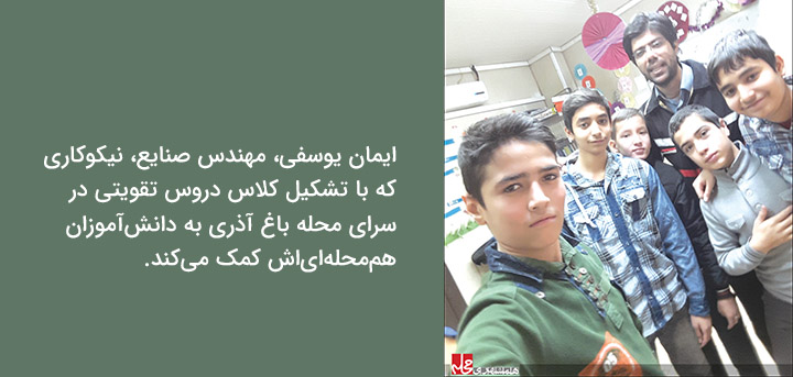 «ایمان یوسفی» لیسانس مهندسی صنایع دارد و مدتی است که با تشکیل کلاس دروس تقویتی در سرای محله باغ آذری به دانشآموزان هممحلهایاش کمک میکند. به گفته خودش سالها قبل یعنی زمانی که دانشآموز مدرسه بوده در درس ریاضی ضعیف بود و با کمک یکی از همسایهها به نام «حسین حقی» توانسته ضعف درسیاش را رفع کند. او میگوید: «کمک این فرد به من باعث شد تا علاوه بر تقویت درسها بتوانم با پشتکار بیشتری درس بخوانم و وارد دانشگاه شوم. محبت حقی باعث شد امروز رفتار دیروز او را انجام دهم و انگیزهای برای تشکیل کلاس تقویتی در سرای محله باغ آذری شد.» کلاسهای تقویتی یوسفی برای پایههای پنجم و نهم است. او میگوید: «دانشآموزان این 2 پایه تحصیلی میتوانند رایگان در کلاسها شرکت کنند و از مباحث مطرح شده بهرهمند شوند.» برای شرکت در این کلاس محدودیتی وجود ندارد. یوسفی میگوید: «علاوه بر دانش آموزانی که ضعف تحصیلی دارند افراد دیگری که علاقهمند به ریاضی و فیزیک هستند هم میتوانند در این کلاس ها ثبتنام و شرکت کنند.» کلاسهای تقویقی رایگان سرای محله باغ آذری پنجشنبهها ساعت 8 تا 10 برای پایههای نهم و ساعت 10 تا 12 برای پایههای پنجم تشکیل میشود. یوسفی قصد دارد برای پایههای دیگر تحصیلی هم کلاس تشکیل دهد. او میگوید: «در محله معلمانی هستند که میتوانند در این کار کمک کنند و تجربه تحصیلی و آموختههای خود را در اختیار دانش آموزان قرار دهند. اگر مسئولان همکاری کنند میتوانیم این کلاسها را در پایههای دیگر تحصیلی هم برگزار کنیم.» تمرین اولویت کلاس تقویتی است. یوسفی میگوید: «در این کلاسها دانشآموزان از طریق تمرین مداوم و مستمر دروس، ضعفشان را تقویت میکنند.» به گفته وی دانشآموزان محلههای دیگر هم میتوانند در این کلاسها شرکت کنند.