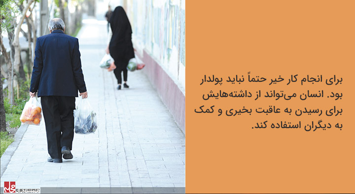 «کاظم کاظمزاده» 27 ساله سالهای زیادی است که به سالمندان محله کمک میکند. او که حتی مایل نیست عکسی از خدمات خیرخواهانه اش منتشر شود، درباره دلیل کمکش به سالمندان میگوید: «یک خانم سالمند را دیدم که کیسههای خرید را به سختی حمل میکند. جلو رفتم و کیسهها را از دستش گرفتم و او را به منزل رساندم. همان روز تصمیم گرفتم به سالمندان محله مان کمک کنم.» او سالمندان محله را میشناسد و به گفته خودش مرتب به آنها سر میزند و در صورت نیاز کارهایشان را انجام میدهد. کاظمزاده میگوید: «حالا تا حدود زیادی سالمندان محله یاخچی آباد را میشناسم و به خانهشان رفتوآمد میکنم و میدانم که هر کدام نیاز به چه کمکی دارند.» او درباره نحوه کمک میگوید: «علاوه بر خرید برخی از سالمندان محله نیاز دارند که کسی آنها را به دکتر ببرد یا داروهایشان را از داروخانه بگیرد. من با جان و دل این کارها را انجام میدهم و هیچ چشمداشتی هم ندارم.» کاظمزاده امیدوار است که در آینده بتواند به سالمندان کمک مالی هم بکند. او میگوید: «وضع اقتصادی برخی سالمندان خوب نیست و دلم میخواهد در آینده بتوانم به آنها کمک مالی کنم.» او حاضر نیست دعای عاقبت بخیری سالمندان محله را با پول عوض کند. کاظمزاده میگوید: «وقتی به سالمندان محله کمک میکنم برایم دعای خیر میکنند و وقتی میگویند: عاقبت بخیر شوی، برایم ارزشمند است و حاضر نیستم این دعا را با پول عوض کنم.» به گفته کاظمزاده این دعا تضمین آیندهاش است. او با توصیه به جوانان دیگر میگوید: «برای انجام کار خیر حتماً نباید پولدار بود. انسان میتواند از داشتههایش برای رسیدن به عاقبت بخیری و کمک به دیگران استفاده کند.»