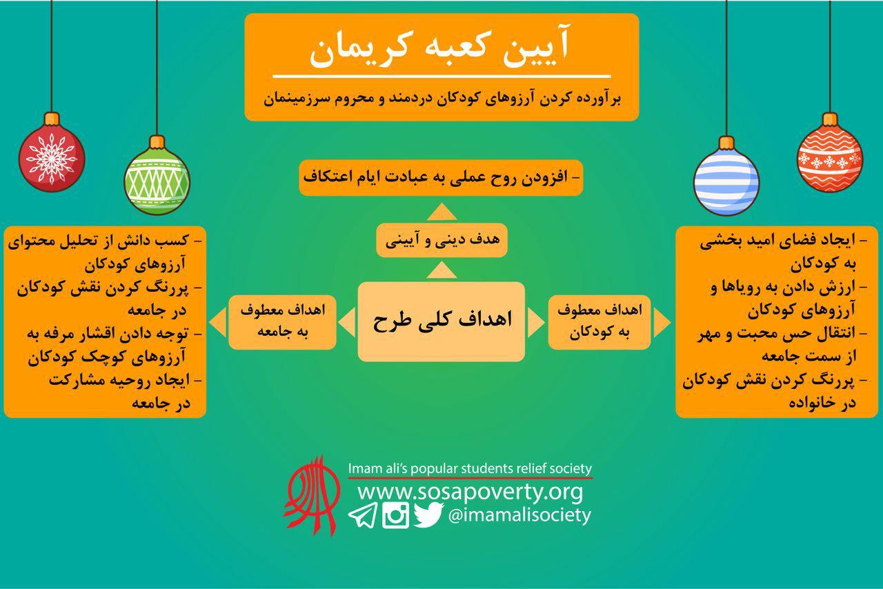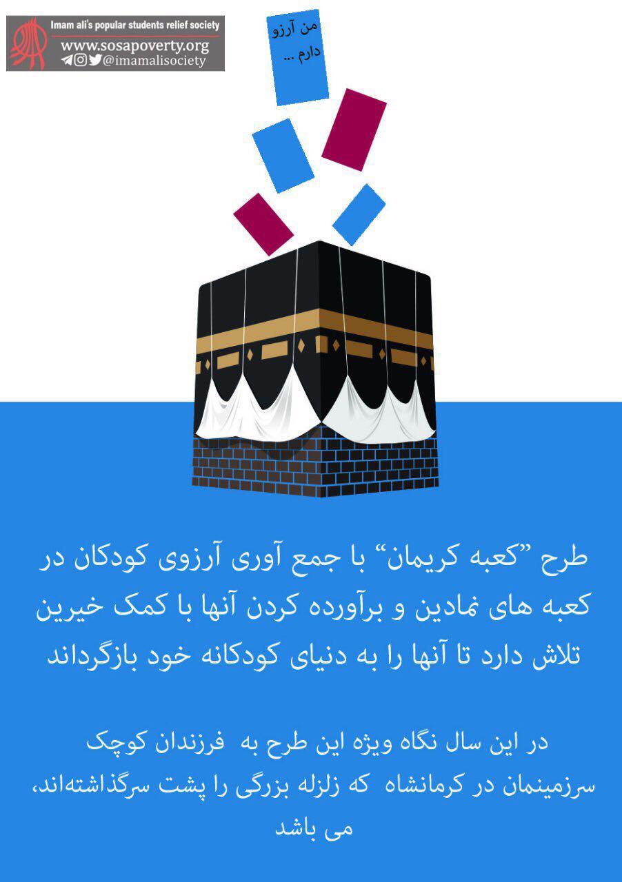 جمعیت امداد دانشجویی–مردمی امام علی(ع) امسال طرح «کعبه کریمان» را با هدف برآورده کردن آرزوی کودکان زلزلهزده کرمانشاه برگزار میکند. نیکوکاران میتوانند تا قبل از نیمه شعبان در این کار نیک مشارکت داشته باشند.