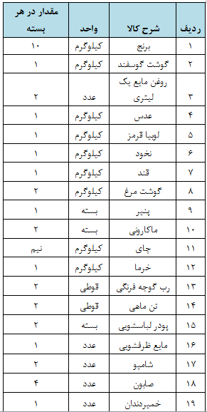 اقلام اصلی موجود در کیسهها شامل برنج، روغن، گوشت، مرغ، عدس، لوبیا قرمز، نخود، قند، شکر، رب گوجه فرنگی، خرما، پنیر، ماکارونی، چای، تن ماهی، مایع ظرفشویی، پودر لباسشویی، شامپو، صابون و خمیردندان میباشد.