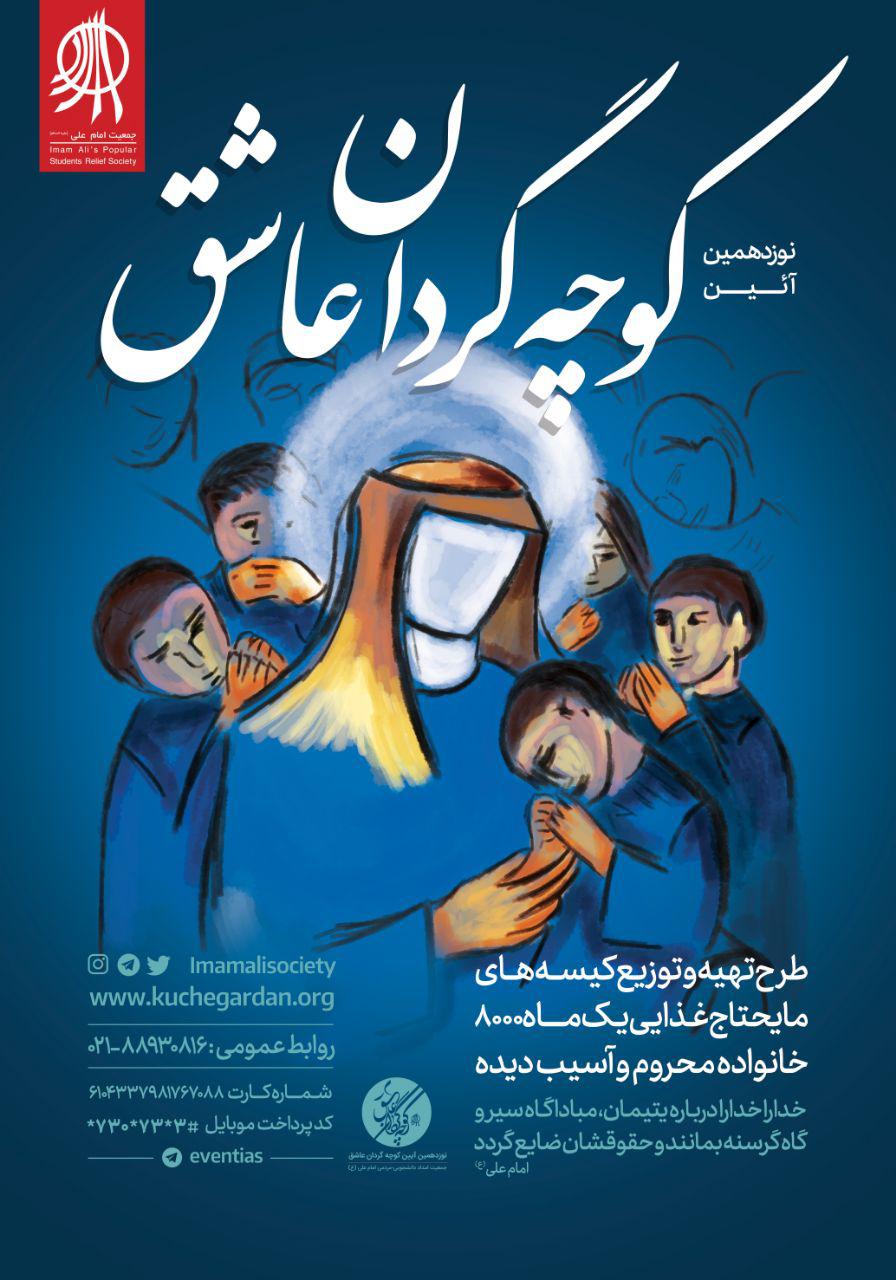 «کوچه گردان عاشق» طرح جمعیت امام علی (ع) است که از سال 1378 اجرا میشود در این طرح کیسههای مایحتاج مورد نیاز یک ماهه هزاران خانواده محروم توسط نیکوکاران و خیرین تامین و توسط دانشجویان و داوطلبان در شبهای قدر توزیع میشود.