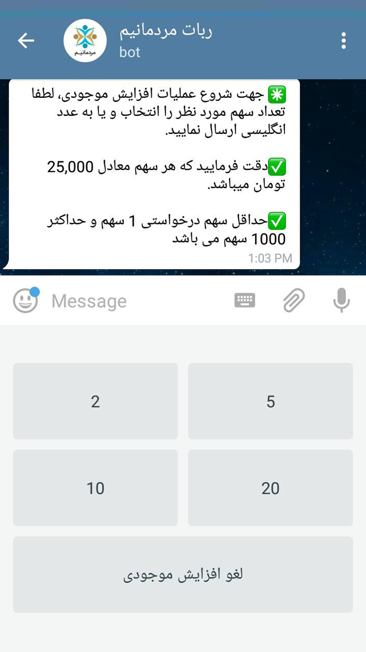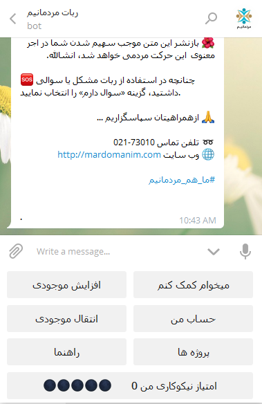 سپس با استفاده از ربات این کانال به نشانی mardomanim_bot@ میتوانید در پروژه های خیر خواهانهای که اعلام میشود، مشارکت نمائید.