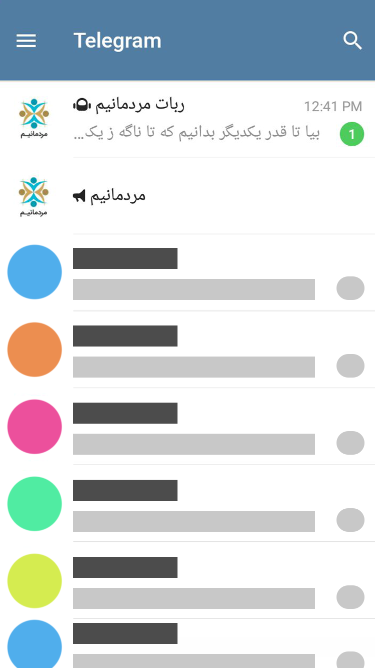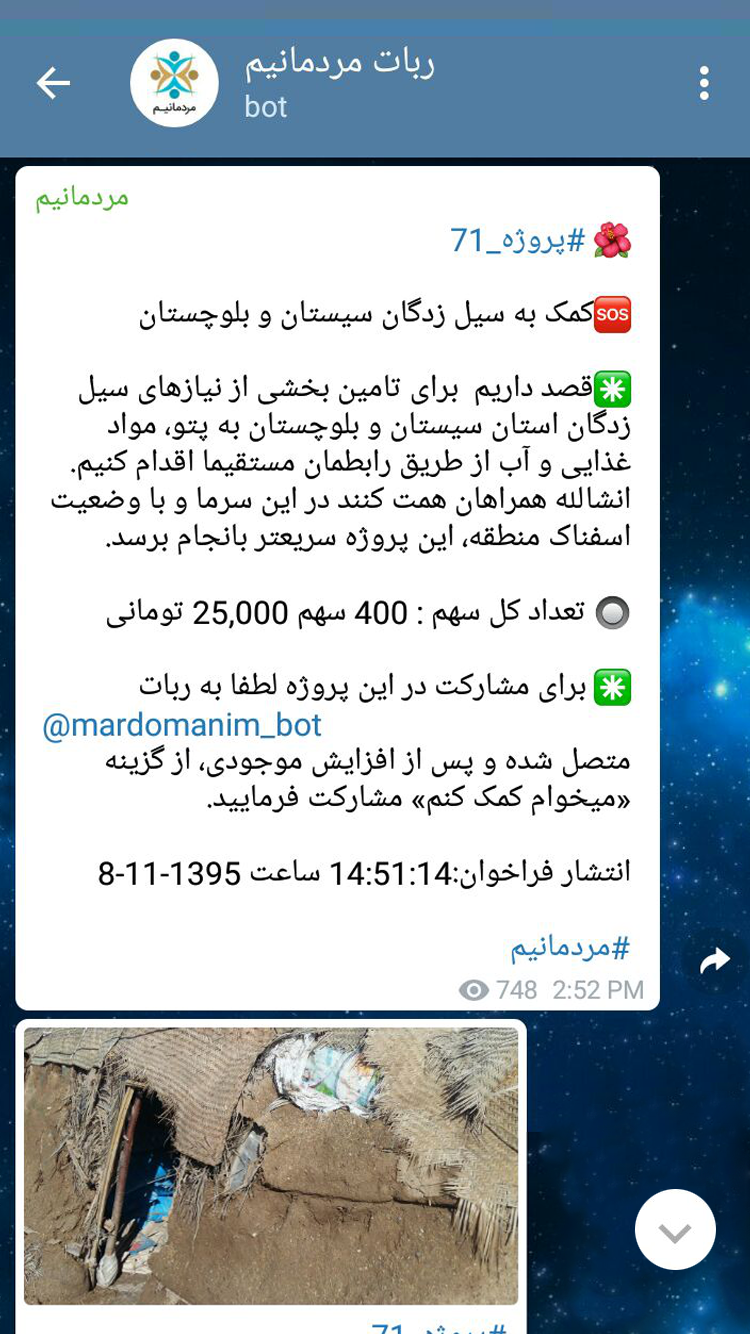 گروهی با نام #مردمانیم از سال 1393 برای جمع سپاری امور خیریه توسط جمعی از مدیران شرکتهای IT در وایبر راهاندازی شد. از سال 1394 گروه فوق به تلگرام مهاجرت کرده و اخیرا به صورت خلاقانه و جذابی به فناوری ربات مجهز شده است.