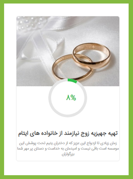 در طی سالهای متمادی فعالیت این موسسه، یکی از اولویتها و رسالت مهم ما کمک به تهیه جهیزیه برای دختران یتیم و نیازمند تحت پوشش این موسسه بوده و علی رقم اهدا بیش از 15 فقره جهیزیه در سال و چند ده فقره کمک هزینه ازدواج به این عزیزان، شاهد مراجعات مکرر نیازمندان جهت این امر خطیر هستیم که در بسیاری از موارد به دلیل کمبود بودجه موفق به کمک رسانی به این عزیزان نمیشویم. مع الوصف خوشحالیم که با کمک شما نیک اندیشان و خیرین گرامی در این راه قدم گذاشته و باعث خوشحالی یتیمی میشویم که در طول سالها از نعمت پدر محروم بوده و در آستانه ازدواج دست پدرانه شما عزیزان گرمی بخش زندگی این نوعروس میگردد.