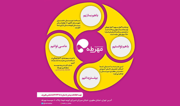 موسسه خیریه مهرطه؛ مرکز غیرانتفاعی و مردم نهادی است که با هدف نگهداری شبانهروزی از دختران بیسرپرست و بدسرپرست فعالیت خود را آغاز کرده است. مهرطه قصد دارد مدرسهای دخترانه در شهرستان «هامون» از توابع سیستان و بلوچستان بسازد. ساخت این مدرسه 8 فاز دارد که هر فاز آن شامل 750 سهم است مبلغ در نظر گرفته شده برای هرسهم 20 هزار تومان است.