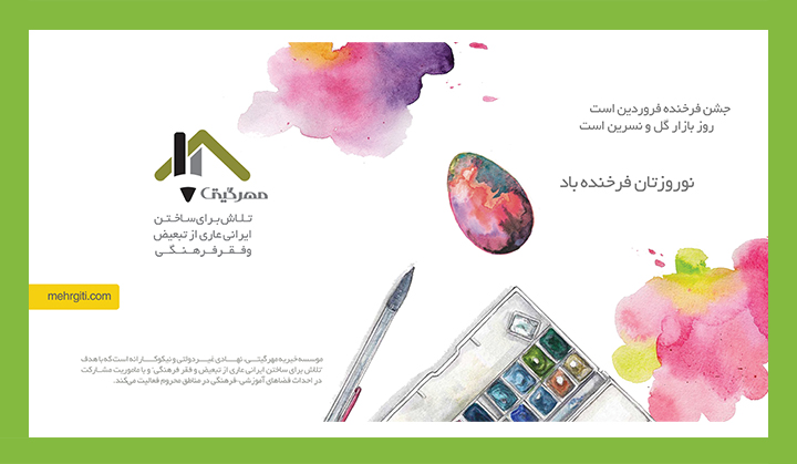 «موسسه خیریه مهرگیتی» به شما پیشنهاد میکند که برای تبریک عید نوروز به عزیزانتان از کارتهای تبریک مهرگیتی استفاده کنید تا در کنار به یادگار گذاشتن خاطرهای زیبا، کودکان مناطق محروم کشورمان نیز از عواید حاصل از این کارتها بهرهمند گردند.