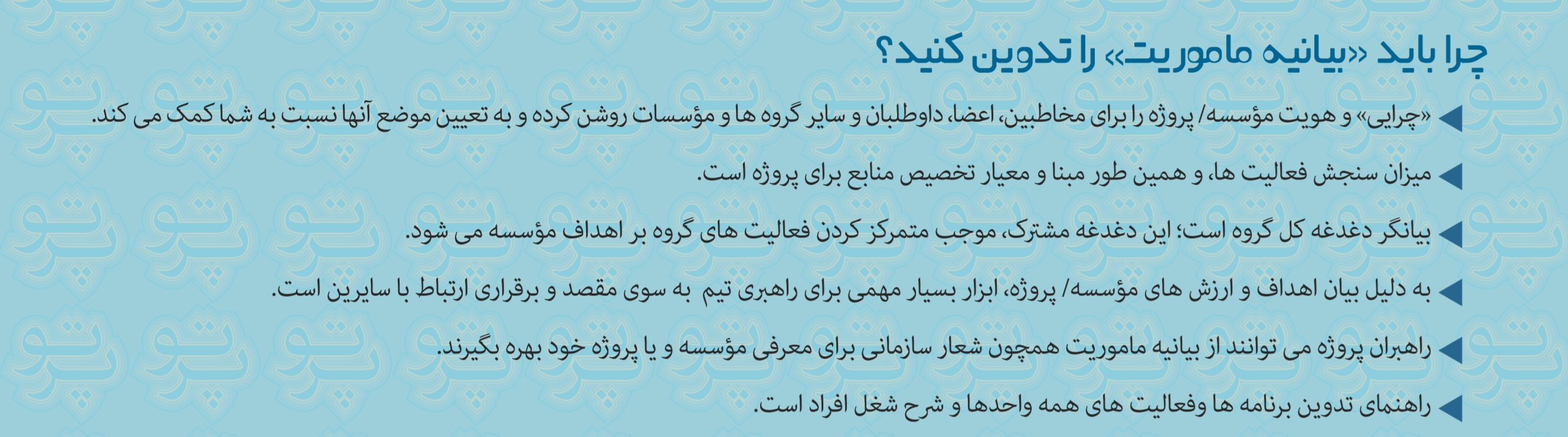 خیریه شما به دیگران و حتی اعضای گروه و تیم کاری خودتان است. این بیانیه میتواند راهنمای تدوين برنامهها و فعاليت همه واحدها و شرح شغل افراد باشد.