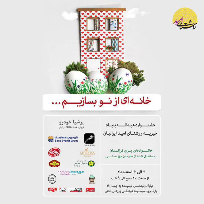 جشنواره ی عیدانه بنیاد خیریه «روشنای امید ایرانیان» از ٣ الی ۶ اسفند ماه از ساعت ١٠صبح الی ٩ شب در مجموعه فرهنگی ورزشی تلاش برگزار میشود.