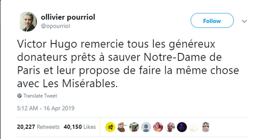 «اولیویه پوریول»، فیلسوف فرانسوی نیز با اشاره به کتابهای معروف «ویکتور هوگو» یعنی «گوژپشت نوتردام» و «بینوایان» در توییتر نوشت: «ویکتور هوگو قطعا از تمام نیکوکارانی که برای نجات نوتردام همت کردند، تشکر کرده اما همزمان به آنها پیشنهاد میکند که برای بینوایان هم همین کار را بکنند.»
