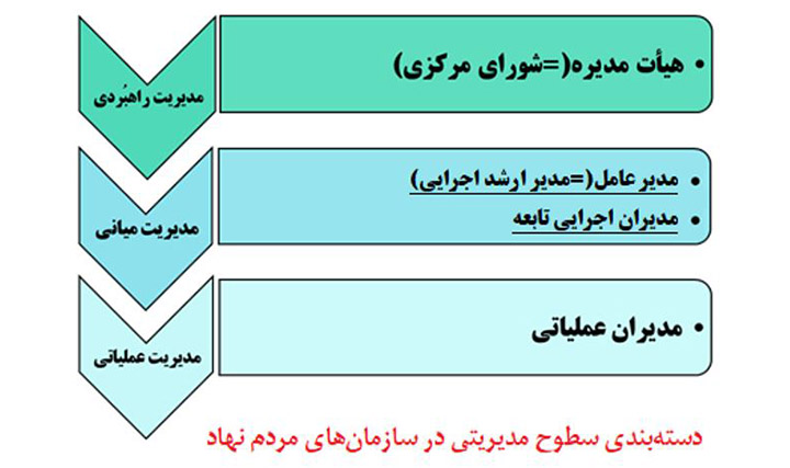 به طور کلی، مدیریت یک سازمان به سه سطح «راهبُردی»، «میانی» و «عملیاتی» دستهبندی میشود. در یک سازمان مردم نهاد، «مدیریت راهبُردی» برعهدهی «هیأت مدیره»ی سازمان است. «مدیر ارشد اجرایی» و «مدیران اجرایی تابعه» نیز «مدیریت میانی» سازمان را برعهده دارند. و نهایتاً «مدیریت عملیاتی» برعهده «مدیران عملیاتی» است.
