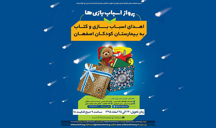 اسباببازی و کتابهای ارسالی شهروندان در قالب برنامه «پرواز اسباببازیها» از 23 تا 25 اسفندماه به بیمارستان کودکان اصفهان اهدا میشود.