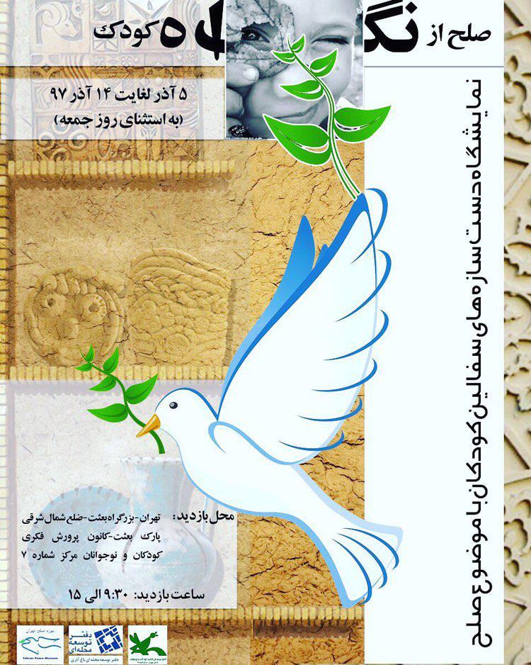 نمايشگاه دست سازهاى سفالين كودكان با موضوع صلح با همكاری دفتر توسعه محله باغ آذری، موزه صلح تهران و کانون پرورش فکری کودکان و نوجوانان استان تهران (مرکز شماره 7 ) برگزار میشود.