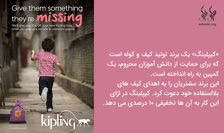 «کیپلینگ»، برند تولید کیف و کوله پشتی است. این برند، در راستای مسئولیت اجتماعی خود و به منظور کمک به دانش آموزان بی بضاعت، کمپینی برگزار کرده که از طریق آن مشتریان خود را تشویق می کند که کیف و لوازم قابل استفاده خود را اهدا کنند و در ازای آن، 10% تخفیف برای خرید بعدی از فروشگاه، دریافت نمایند.