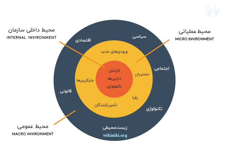 همانطور که گفتیم، وظیفۀ تحلیل PESTLE بررسی محیط بیرونی سازمان شما است. اما شاید برایتان این سوال پیش بیاید که محیط بیرونی کجاست و بقیه محیطها کدامند؟ برای پاسخ به این سوال، دایره زیر را با دقت نگاه کنید.