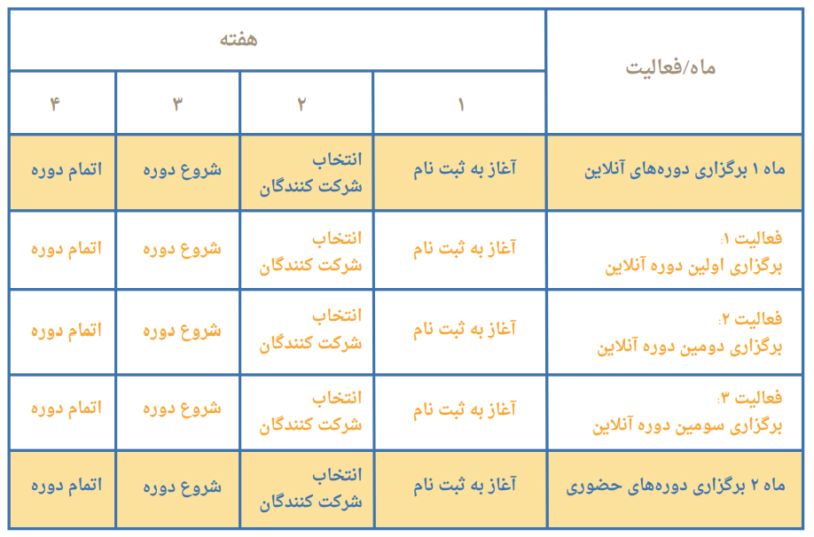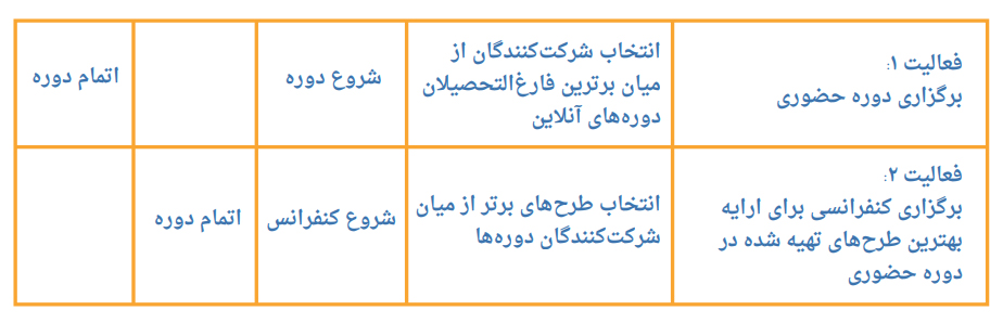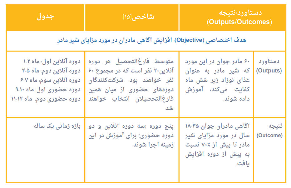 در زیر یک نمونه چارچوب منطقی معرفی می شود؛ این نمونه شامل دو بخش است. یک جدول مربوط به اهداف و دستاوردها و جدول دیگر مربوط به زمان بندی فعالیت ها است.