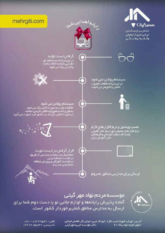 موسسه خیریه مهرگیتی کامپیوترهای فرسوده و یا لوازم جانبی نو یا دست دوم شما دریافت و در صورت نیاز پس از انجام تعمیرات آنها را به مناطق محروم ارسال میکنند.