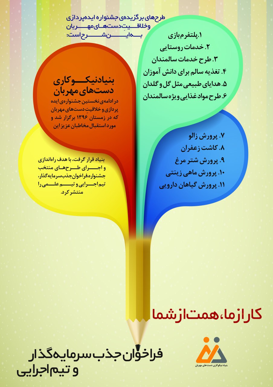با توجه به اینکه سال ۱۳۹۷ بهعنوان سال مصرف کالای ایرانی در راستای حمایت از تولید ملی و طرحها و ایدههای داخلی انتخاب شده است بنیاد نیکوکاری دستهای مهربان در راستای اجرای مسئولیت اجتماعی خود، در زمستان ۹۶ جشنوارهای تحت عنوان ایدهپردازی و خلاقیت برگزار کرد که طی آن تعدادی از طرحها توسط هیأت داوران برگزیده شد. در همین راستا و طبق اعلام قبلی، بنیاد دستهای مهربان از سرمایهگذاران، تیمهای اجرایی و تیمهای علمی دعوت میکند تا با شراکت در راهاندازی و اجرای طرحهای برگزیده علاوه بر ایجاد کسبوکار جدید با میانگین سود بالا، حامی تولید و صنعت داخلی شده و همچنین اقدام به کارآفرینی و اشتغالزایی کنند.