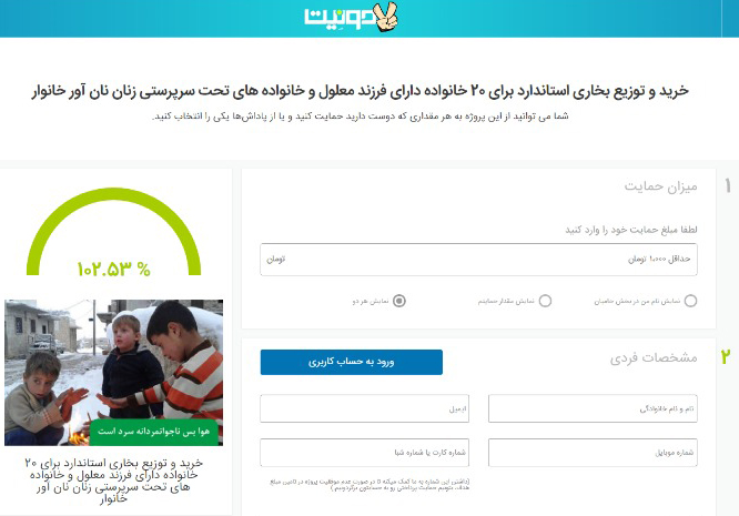 در پروژه «جمعسپاری مالی؛ پروژه خرید و توزیع بخاری برای 20 خانواده» که توسط «ویکینیکی» معرفی شده بود، سامانه کرادفاندینگ «دونیت» اعلام کرد قصد دارد برای تامین هزینه خرید بخاری برای تعدادی خانواده دارای فرزند معلول و خانوادههای تحت سرپرستی زنان نانآور خانوار که توسط مددکاران دلسوز بهزیستی شناسایی شده و مورد تایید موسسه خیریه «نیکگامان» نیز قرار گرفتهاند، جمعسپاری انجام دهد.