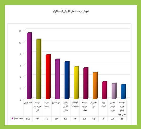 طبق بررسیهای انجام شده موسسه خیریه مهرگیتی بالاترین و موسسه خیریه بهنام دهش پور کمترین درصد تعاملات در اینستاگرام را دارا میباشند.