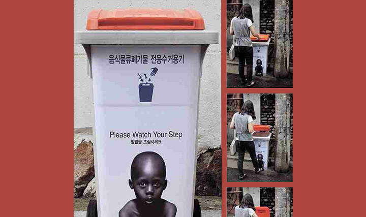 یک بنیاد خیریه در کره جنوبی به منظور هشدار نسبت به اسراف و غذاهایی که دور ریخته میشوند، تصویر جالب و قابل تأملی را بر روی سطلهای زباله سطح شهر، نصب نموده است. شهروندان برای بازکردن در سطل، باید دستهای کودک آفریقایی که بر روی پدال چاپ شده را لگد کنند.