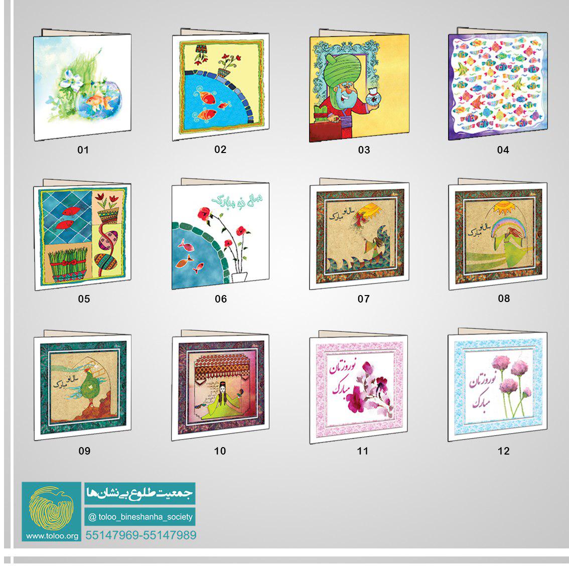 کارت تبریک سال نو 1397 طلوع بینشانها در 12 طرح مختلف طراحی شده است. خیرین می توانند طرح مورد علاقه خود را انتخاب کنند و نام و نشانهی سازمان یا شرکت خود را به همراه متن تبریک دلخواه بطور اختصاصی سفارش دهند. برای تهیه کارت یا کسب اطلاعات بیشتر با تلفن 55147969 و 55147989 تماس حاصل نمایید.