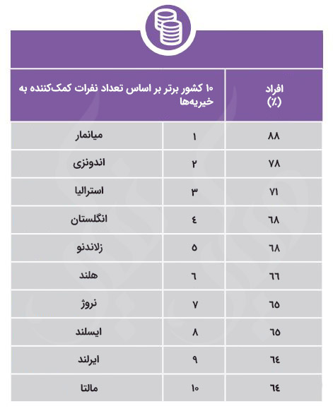 بازگشت به جایگاه ده کشور برتر جداول درصد و تعداد افراد کمک کننده به خیریهها