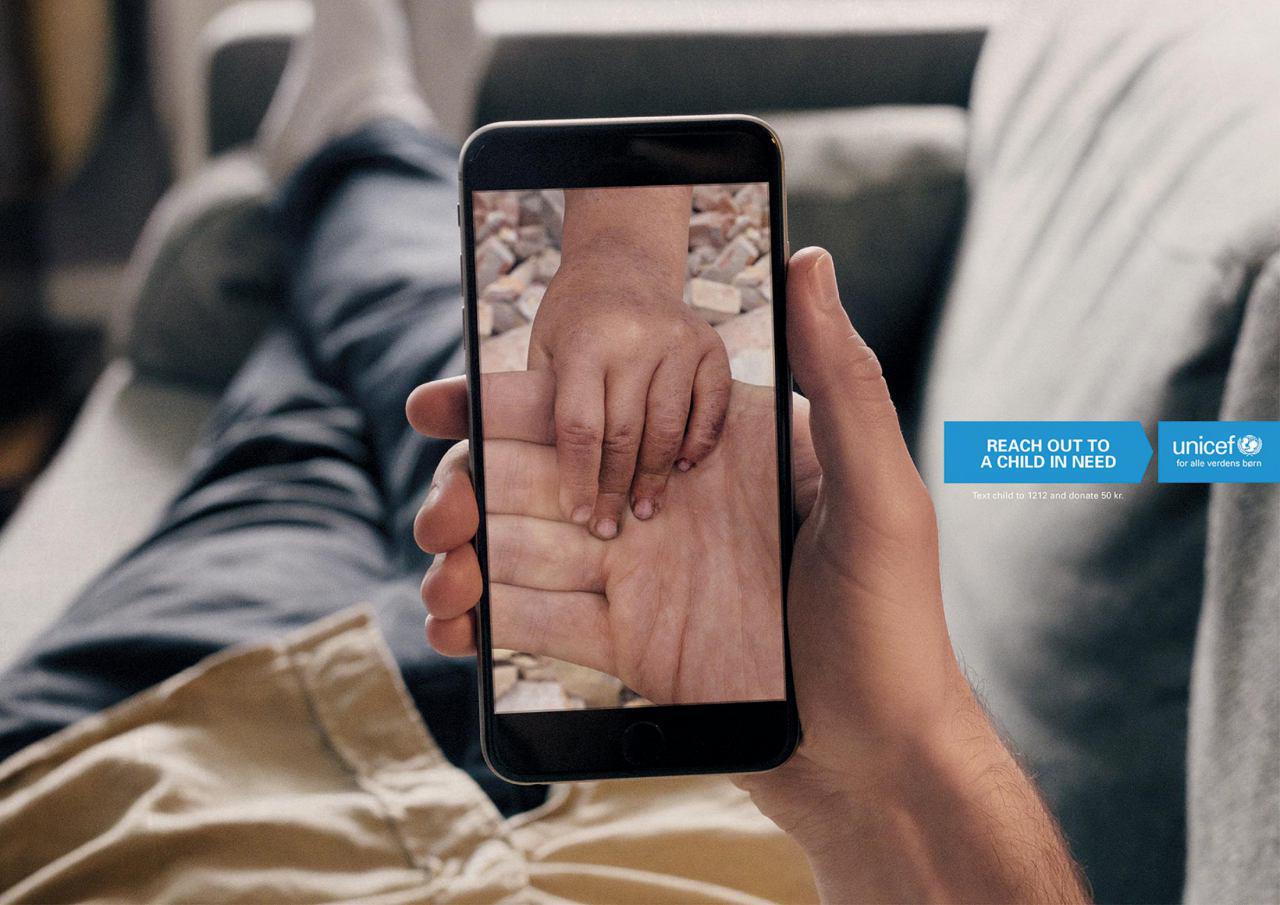 این کمپین تبلیغاتی یونیسف بهشکلی سریع و گویا حمایت از طریق تلفن همراه را نشان میدهد.