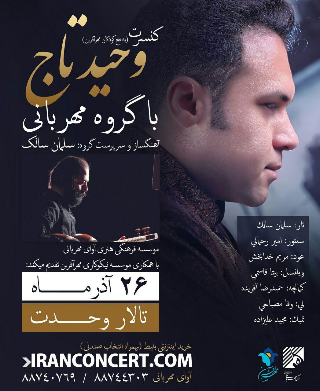 کنسرت «وحید تاج» با همراهی گروه مهربانی و به همت موسسه نیکوکاری مهرآفرین به نفع کودکان زلزله زده کرمانشاه برگزار میشود.