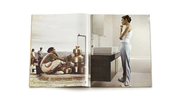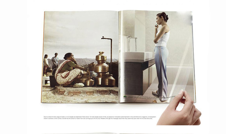 این بنیاد پوستر جالبی برای کمپین خود طراحی نموده است. همانطور که در تصویر میبینید، با ورقزدن، جریان آب از تصویر سمت راست به تصویر سمت چپ که زنی روستایی در آن منتظر برداشتن آب است منتقل میشود.