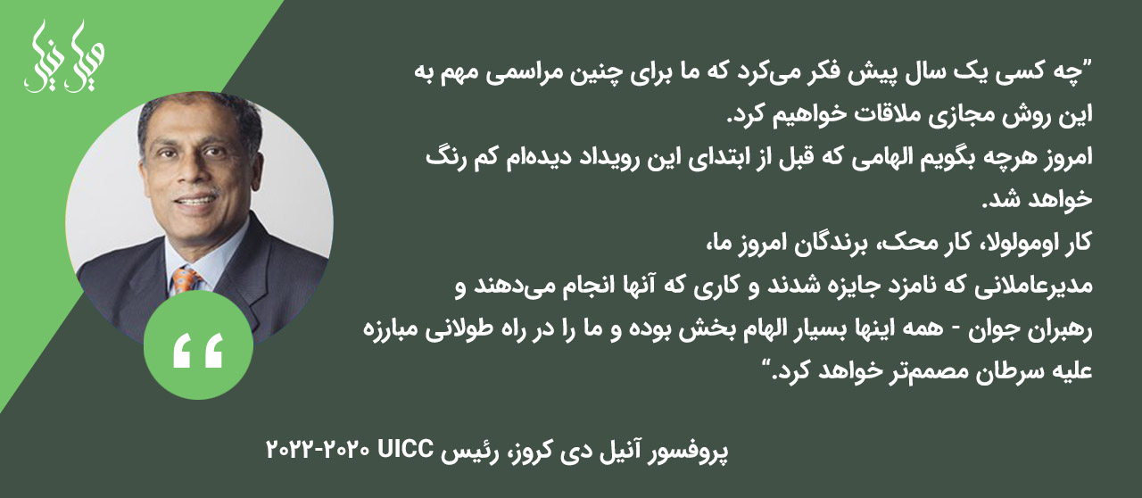 هر چند امسال در تاریخ 24 نوامبر (4 دی ماه) به دلیل همهگیری ویروس کرونا، کنگره جهانی سرطان و جوایز UICC نیز لغو شد، اما جوایزی که مستقیما به برگزاری کنگره مربوط نبودند اهدا شدند تا فعالیت سازمانهای سرطان کماکان شناخته شده و اطلاعرسانی گردند. این جوایز به خانم اومولولا و موسسه محک اهدا شدند.