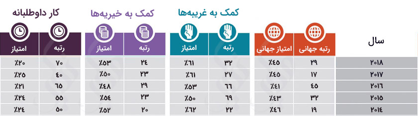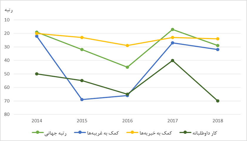 رتبه جهانی ایران در سه شاخص نیکوکاری از سال 2014 تا 2018
