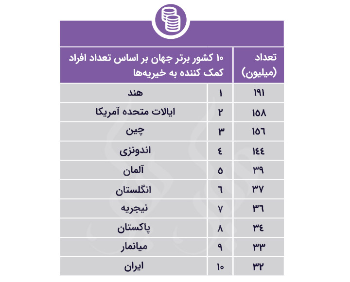 ایران طبق جدول زیر در فاکتور تعداد واقعی افرادی که به خیریهها کمک مالی کردهاند، جایگاه دهم را در جهان به خود اختصاص داده است.