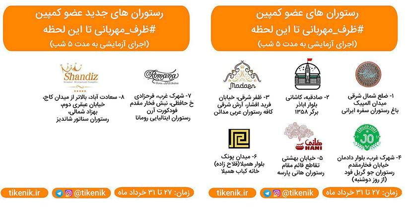 گروه تیکِ نیک کمپین #ظرف_مهربانی را برای اولین بار به صورت آزمایشی در هفته آخر ماه مبارک رمضان به مدت ٥ شب از شنبه ٢٧ تا ٣١ خرداد اجرا نموده و در حال حاضر 8 رستوران واقع در تهران به این کمپین پیوستهاند.